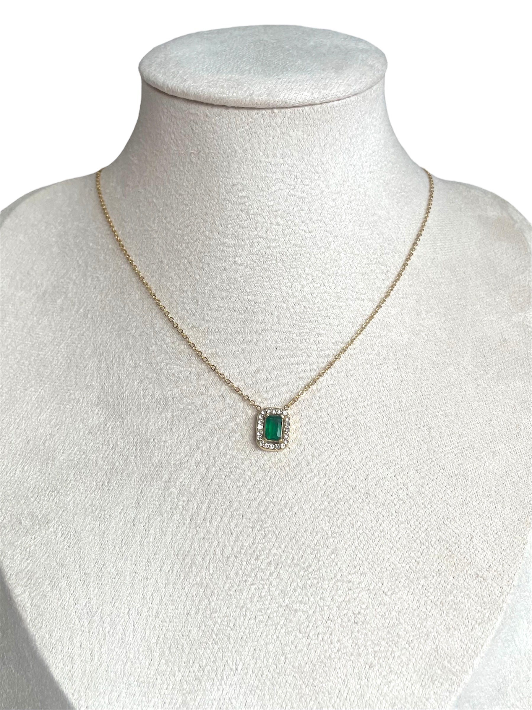 Collier en acier inoxydable avec pierre type émeraude entouré de strass